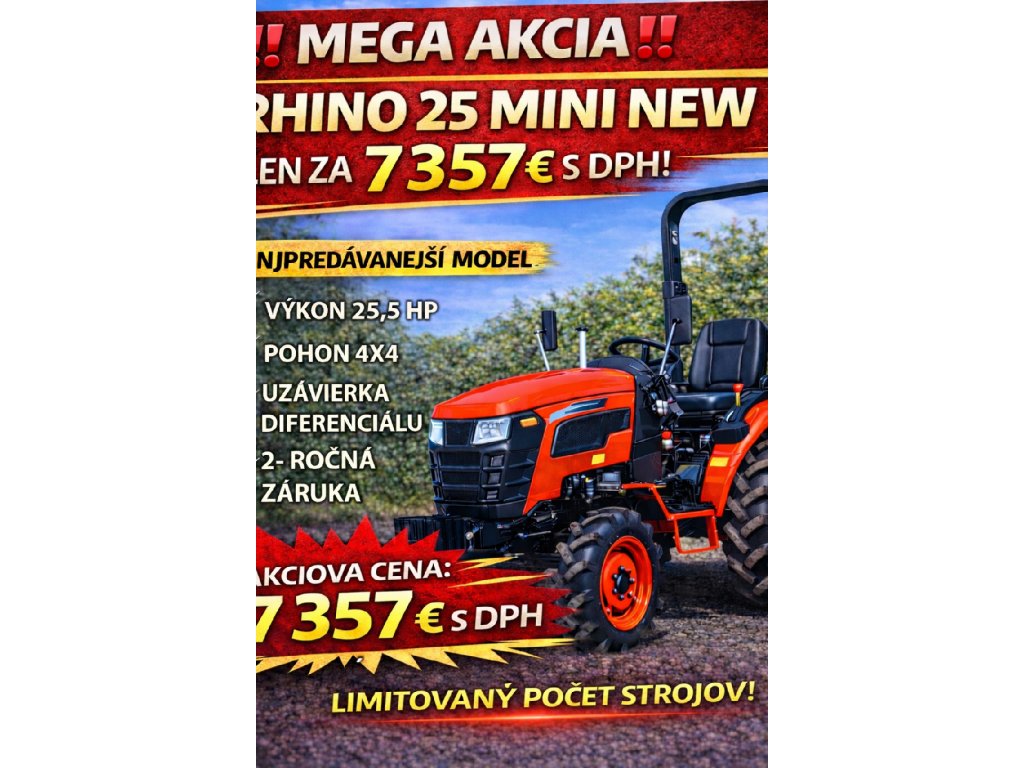 Malotraktory RHINO 25 MINI sú ideálnym pomocníkom pre malých farmárov, záhradníkov, ale aj domácich majstrov. Jedná sa o univerzálny a kompaktný malotraktor Španielskej spoločnosti ZEPPELIN, ktorý je vybavený motorom o výkone 25,5 HP. V základnej výbave je posilňovač riadenia a prevodovka 6 + 2, čím je ovládanie traktora veľmi jednoduché a traktor má 6 rýchlostí dopredu a 2 dozadu. Traktor sa vyznačuje robustnou a pevnou celokovovou konštrukciou a skvelou priechodnosťou vďaka nízkej výške 1840 mm (s ochranným rámom). K traktorom je možné pripojiť veľké množstvo príslušenstva ako napríklad mulčovače, rotavátory, pluhy, kosy, balíkovače, prívesy, drviče, špalíkovače, komunálna technika a mnoho iného.